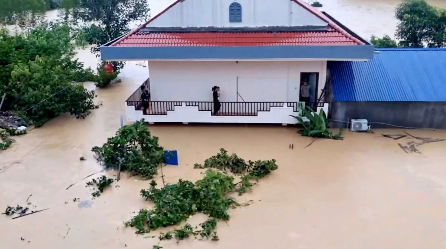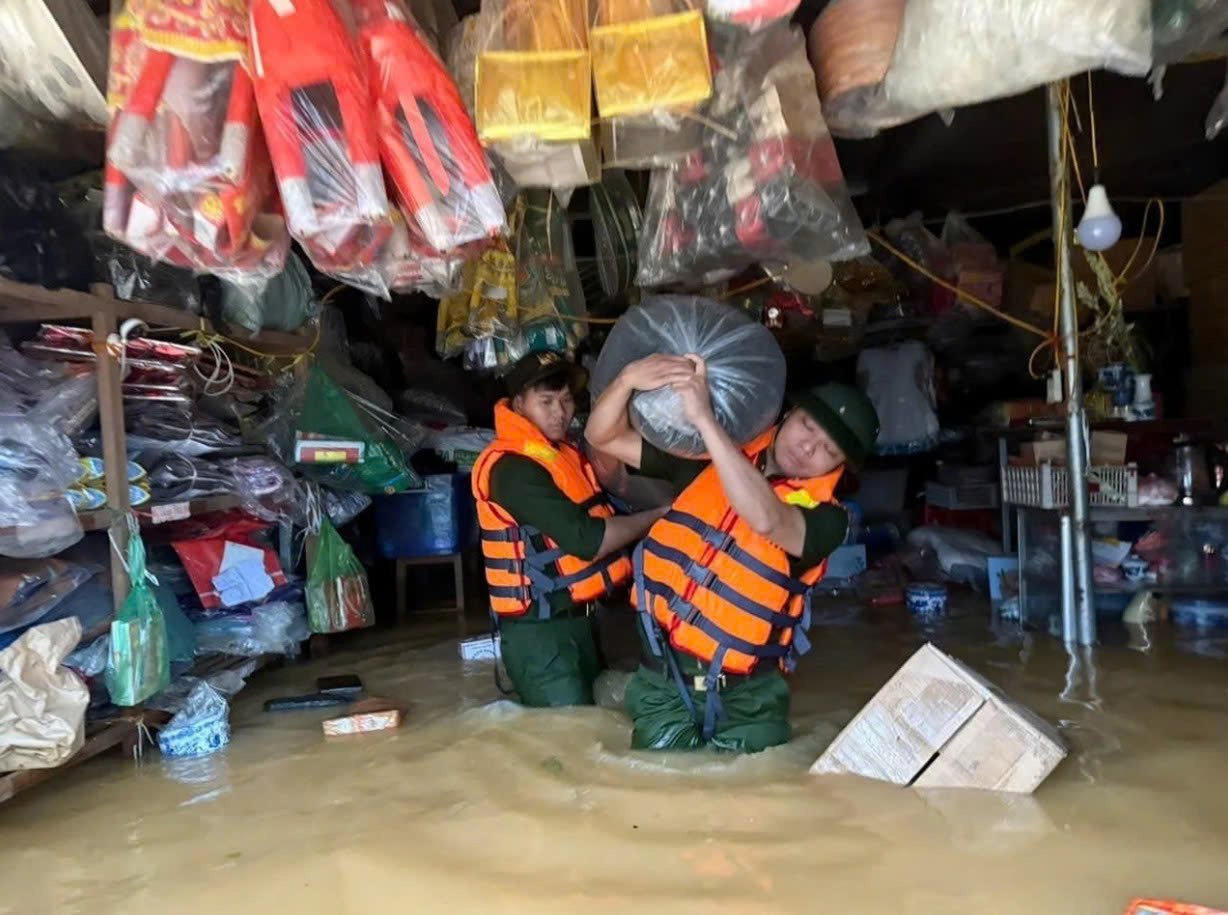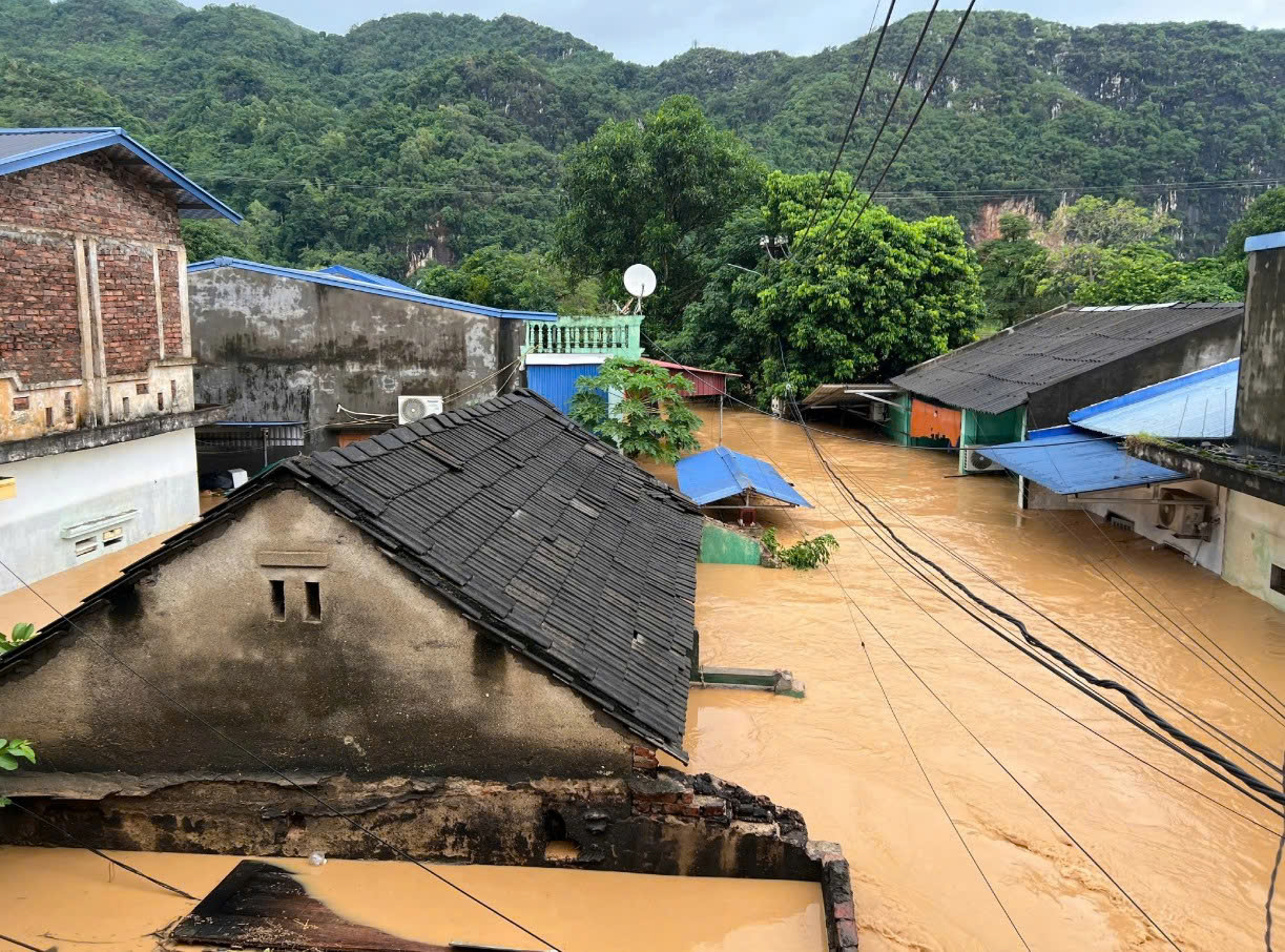 Đến gần trưa ngày 7/10, mực nước tại khu vực tổ dân phố số 1 vẫn dâng hơn 2 mét, nhiều hộ dân bị cô lập hoàn toàn, phải trú trên mái nhà hoặc gác xép trong tình trạng mất điện, hết pin điện thoại và không có lương thực.